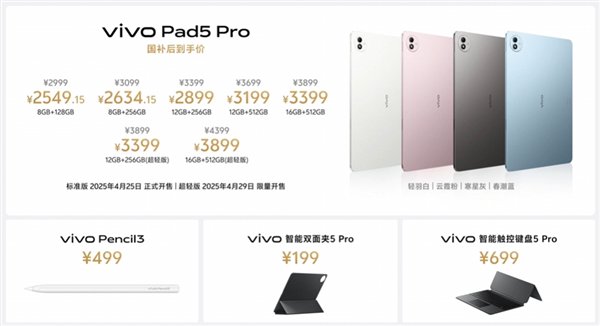 价格方面,vivo Pad5 Pro首发就支持国补,8GB+128GB 2549.15元、8GB+256GB 2634.15元、12GB+256GB 2899元、12GB+512GB 3199元、16GB+512GB 3399元。