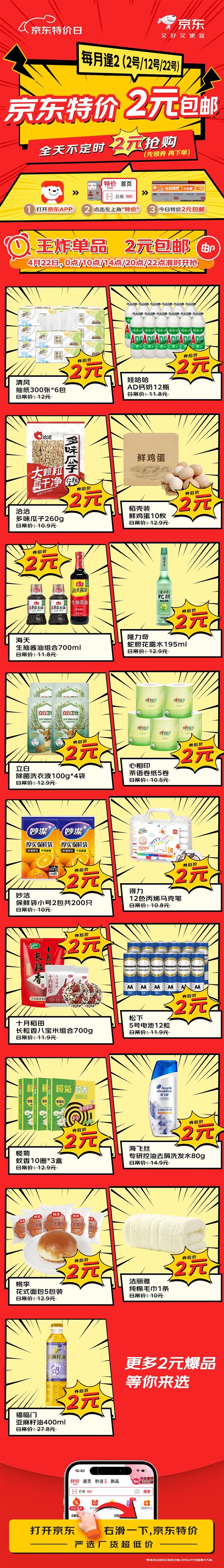 每月逢2(2号/12号/22号)打开京东APP,首页点击“特价”频道戳“2元包邮”专区,即可蹲点领券!