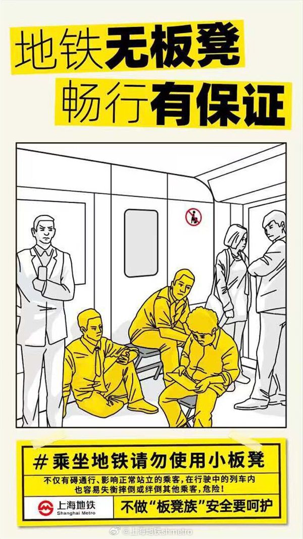 上海地铁表示:“我们不提倡在地铁车厢内使用小板凳,希望广大乘客可以互相提醒,积极配合,文明乘地铁,勿做‘板凳族’。”