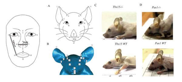 研究人员敲除小鼠的 Tbx15 和 Pax1 基因后发现,Tbx15 基因敲除的小鼠脸更短、耳朵位置更低,Pax1 基因敲除的小鼠鼻子更长。