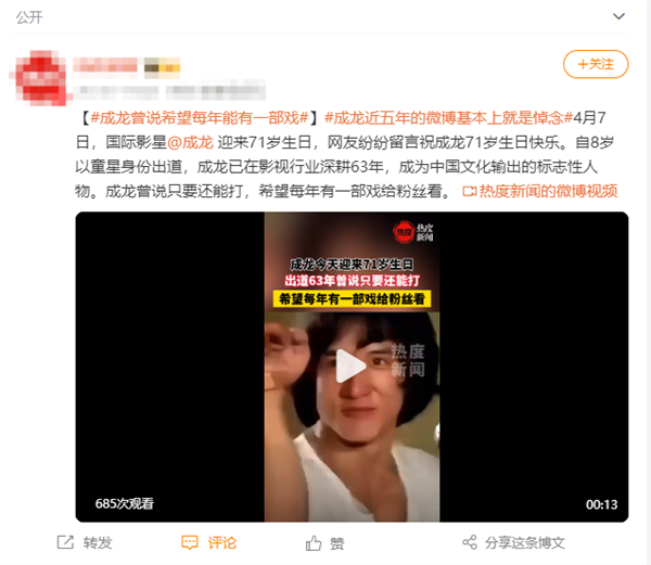 成龙也曾说:“只要还能打,希望每年有一部戏给粉丝看。”