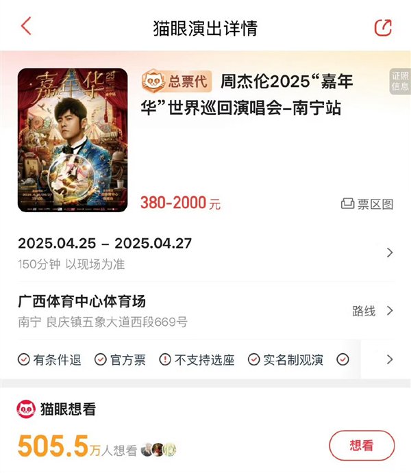 据媒体报道,今天中午,周杰伦2025“嘉年华”世界巡回演唱会南宁站第三次开售,本次售卖包含前期退票和新增的特价大屏观演区。