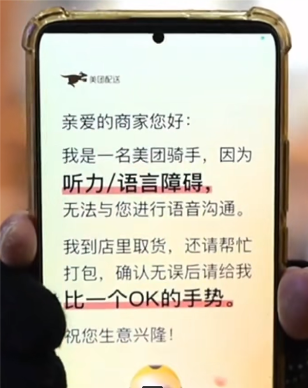针对其中占比超80%的听障骑手,上线了听障专属标识、语音消息速转文字、专属语音通知取货等便捷功能。