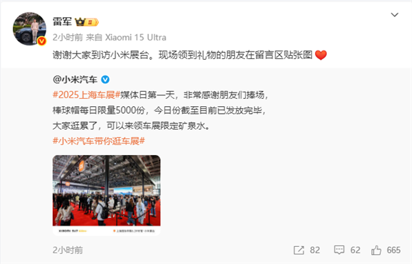 雷军在微博发文并留言称:“谢谢大家到访小米展台,现场领到礼物的朋友在留言区贴张图。车展上,每天送5000顶棒球帽。”