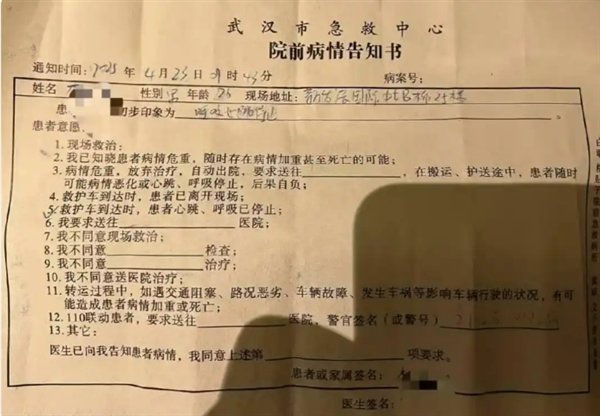 疑似员工晒出一张武汉市急救中心院前病情告知书,显示26岁的李某在救护车到达时呼吸心跳已停止。告知书签署时间为23日上午9点43分,填写的处置地址信息,与猿辅导武汉公司办公地址和楼层相同。