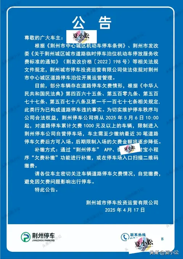 而近期,多地开启追缴的拖欠路边智慧停车费,荆州市某停车投资运营有限公司发布公告称: