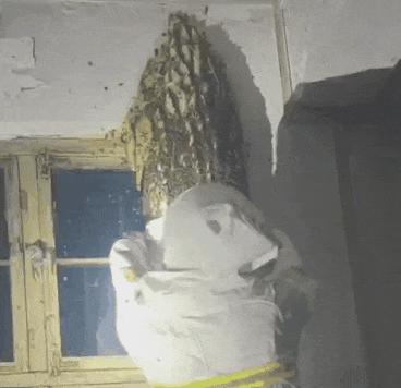 消防员身着专业防蜂服,用密封袋快速摘除蜂巢主体,接着使用杀虫剂驱赶蜜蜂。