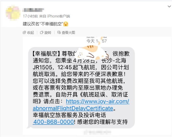 在社交媒体上,已经有大批网友反映,幸福航空的航班频繁临时取消,给出行带来诸多不便且客服电话打不通等问题,有网友还建议幸福航空改名为“不幸福航空”。