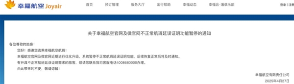 幸福航空官方网站于4月27日发布《关于幸福航空官网及微官网不正常航班延误证明功能暂停的通知》,称近期进行优化升级,系统暂停不正常航班延误证明功能,后续恢复正常后将及时通知。