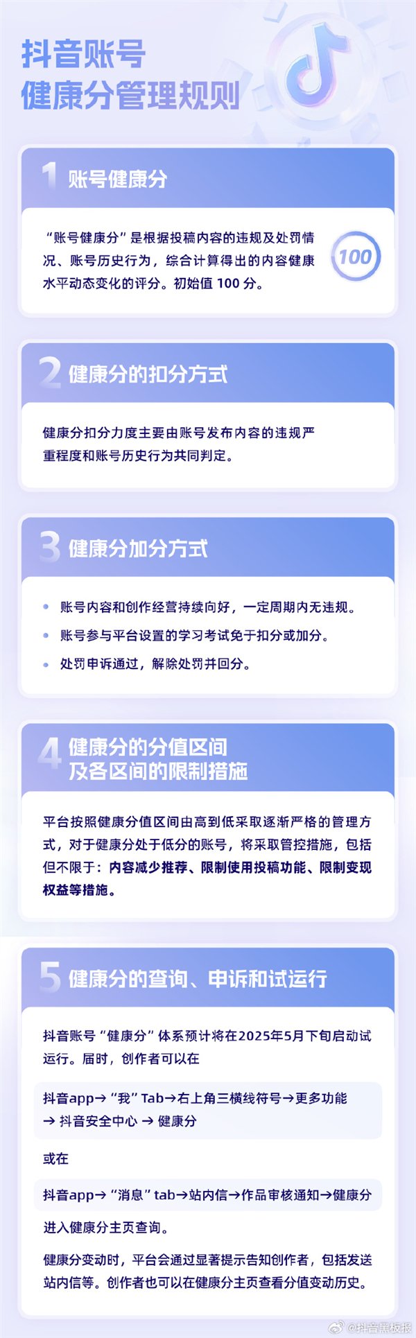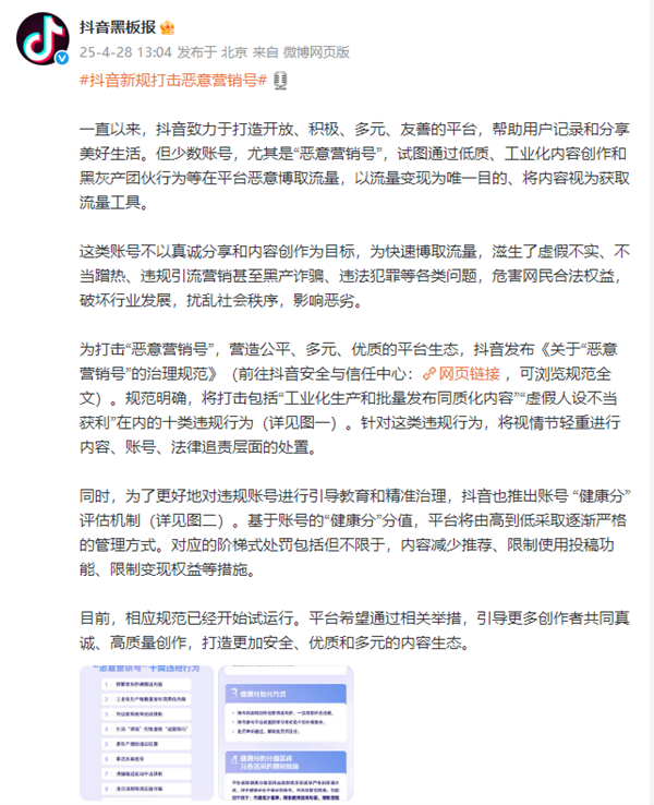 规范明确,将打击十类违规行为,从内容、账号、法律追责三个层面对“恶意营销号”进行处置。同时,抖音还推出账号 “健康分” 评估机制,通过分值管理实现对违规账号的引导教育。