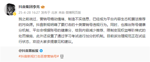 快科技4月28日消息,今日下午,抖音集团副总裁李亮发文称:我之前说过,营销号煽动情绪、制造不实信息,已经成为平台内容生态和算法推荐的污染源。