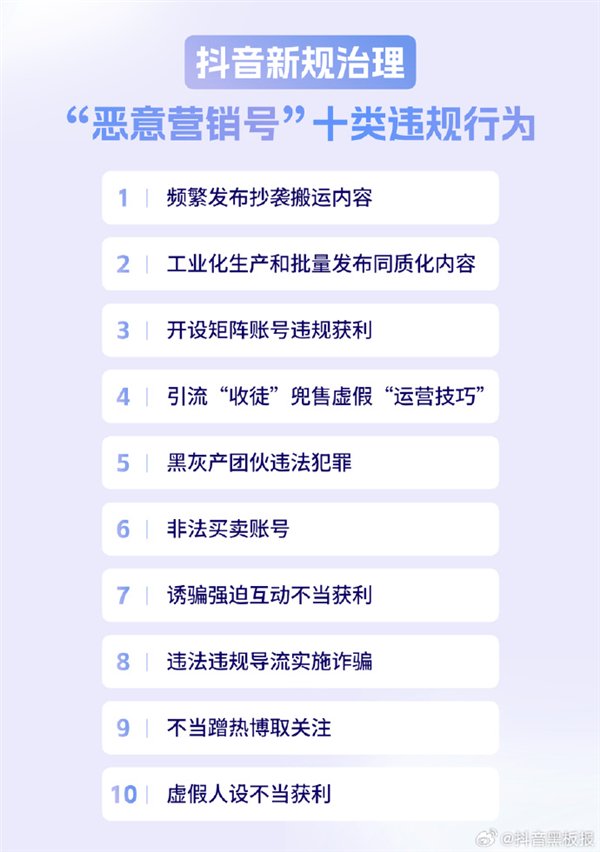 抖音黑板报强调:尤其是“恶意营销号”,试图通过低质、工业化内容创作和黑灰产团伙行为等在平台恶意博取流量,以流量变现为唯一目的、将内容视为获取流量工具。