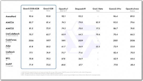 例如,旗舰模型Qwen3-235B-A22B在与DeepSeek-R1、o1、o3-mini、Grok-3和Gemini-2.5-Pro等其他模型进行的编码、数学、通用能力等基准评估中,取得了极具竞争力的结果,能够与DeepSeek-R1、o1、o3-mini、Grok-3和Gemini-2.5-Pro等模型媲美。