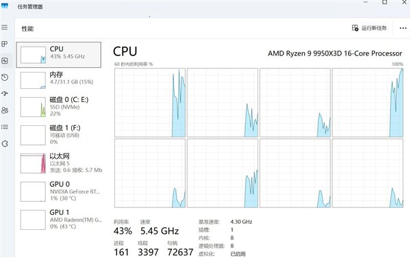 如上图所示,开启X3D游戏模式,锐龙9 9950X3D在系统中就显示出只有8个核心,就是因为另外8个核心被屏蔽掉了。