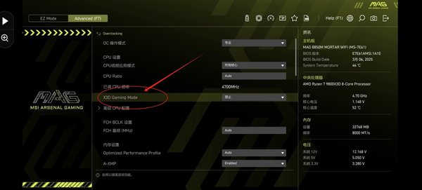 首先介绍一下X3D游戏模式,这个选项位于主板BIOS页面中,通常可以在OC菜单或者简易主菜单中找到,目前笔者测试的各家板厂的B850、X870等主板都自带这一功能,包括华硕、微星、技嘉、七彩虹、蓝宝石等品牌,所以算是AMD平台的一项默认设置,这项功能默认是关闭,需要手动开启。