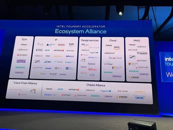同时,英特尔还展示了目前围绕代工服务建立的“生态联盟”版图,除了较为常规的EDA、IP授权外,还包括设计服务、云、MAG(制造保障)、芯粒联盟和价值链联盟。