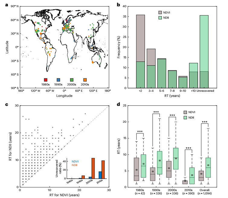 近日,朴世龙院士与合作者基于全球1600个采样点记录的1699起森林死亡事件,利用遥感大数据云计算平台Google Earth Engine,系统分析了15万余幅Landsat影像,揭示了过去40年间森林死亡后植被绿度和冠层含水量恢复速率的变化及其机制。研究发现,自1990年代以来,全球范围内森林死亡恢复所需时间显著延长,恢复速率减缓。可解释性机器学习分析进一步表明,气温升高和降水减少是导致恢复速率减缓的主要原因。虽然森林死亡的严重程度也会影响其恢复过程,但其整体变化不显著,难以解释恢复速率的下降趋势。相比于森林绿度,冠层含水量恢复明显滞后,表明仅根据植被绿度变化会高估森林恢复速率,从而低估森林死亡事件对生态功能的长期负面影响。