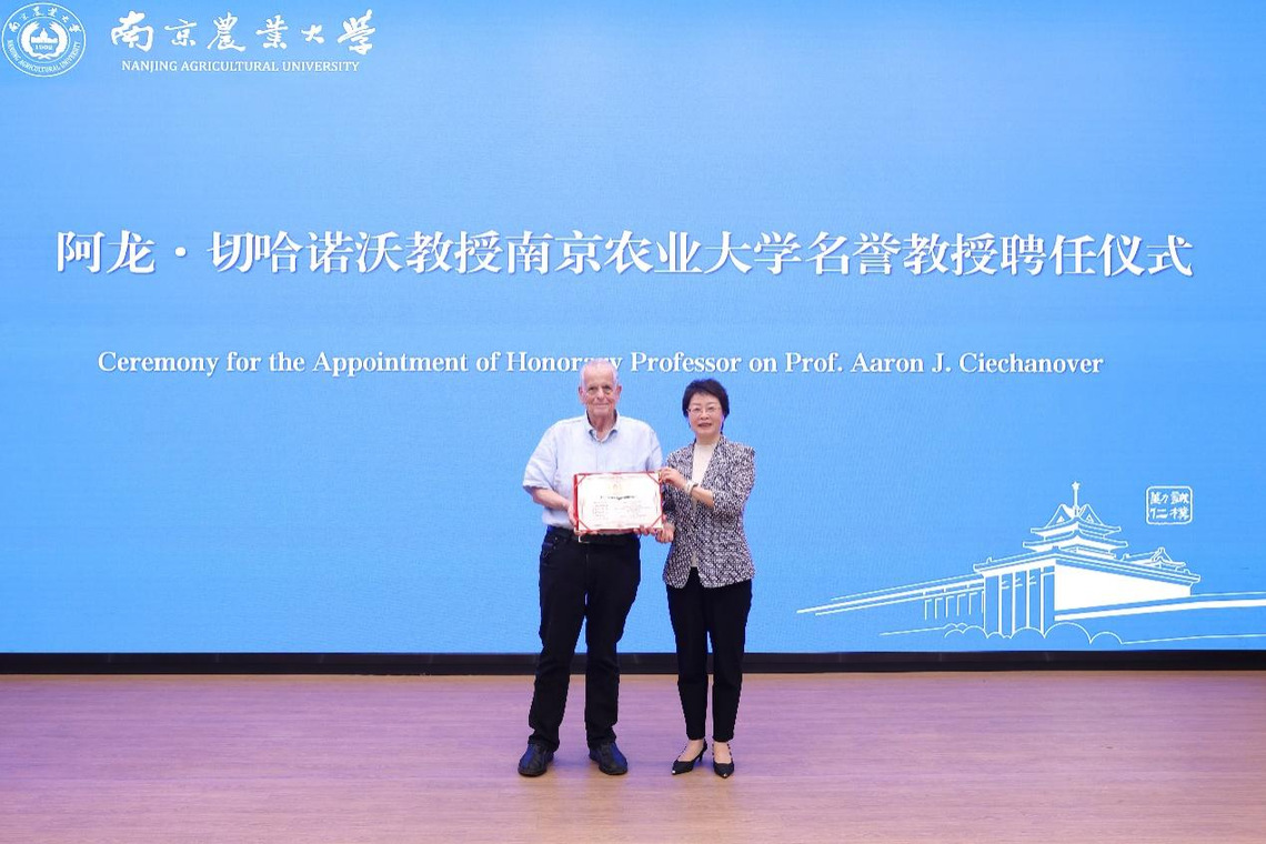 4月27日下午,“与诺贝尔奖得主面对面”活动在卫岗校区图书馆报告厅举行。活动举行了阿龙·切哈诺沃教授南京农业大学“名誉教授”的聘任仪式,朱艳为切哈诺沃颁发了名誉教授证书。
