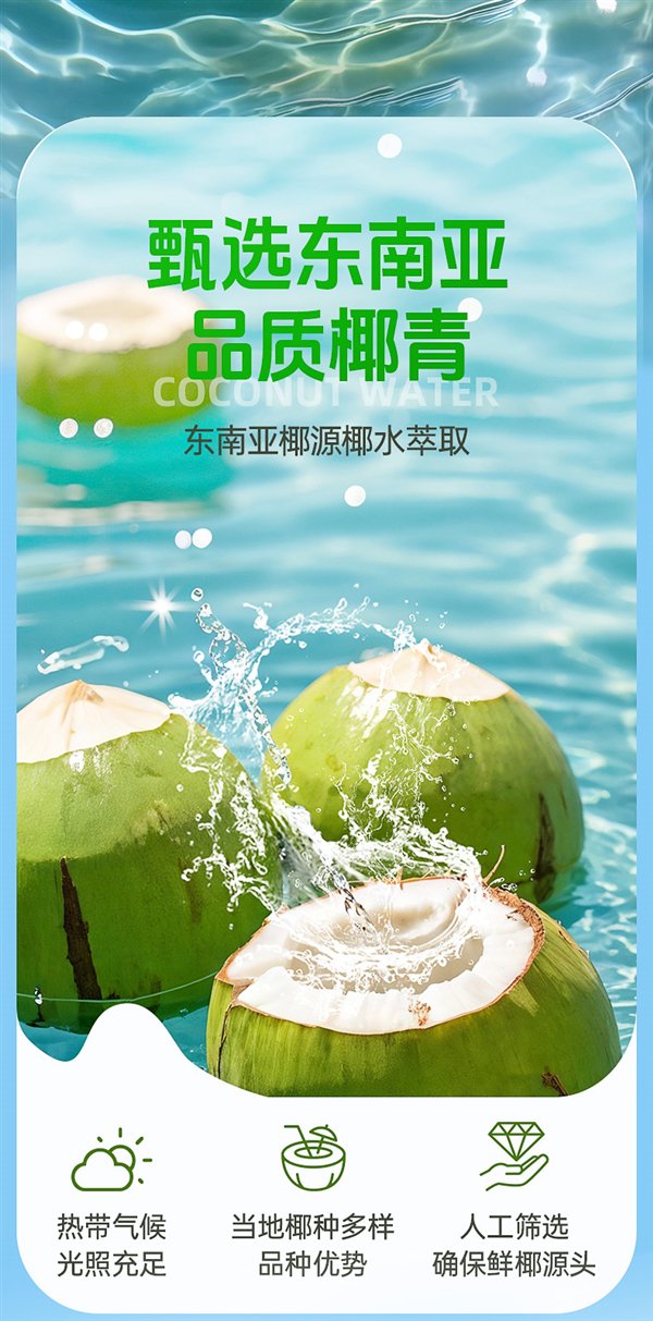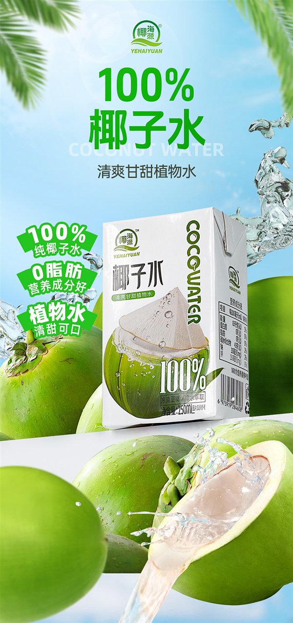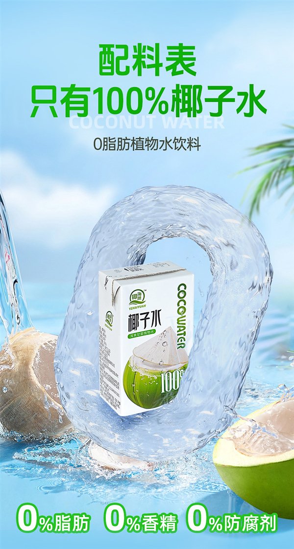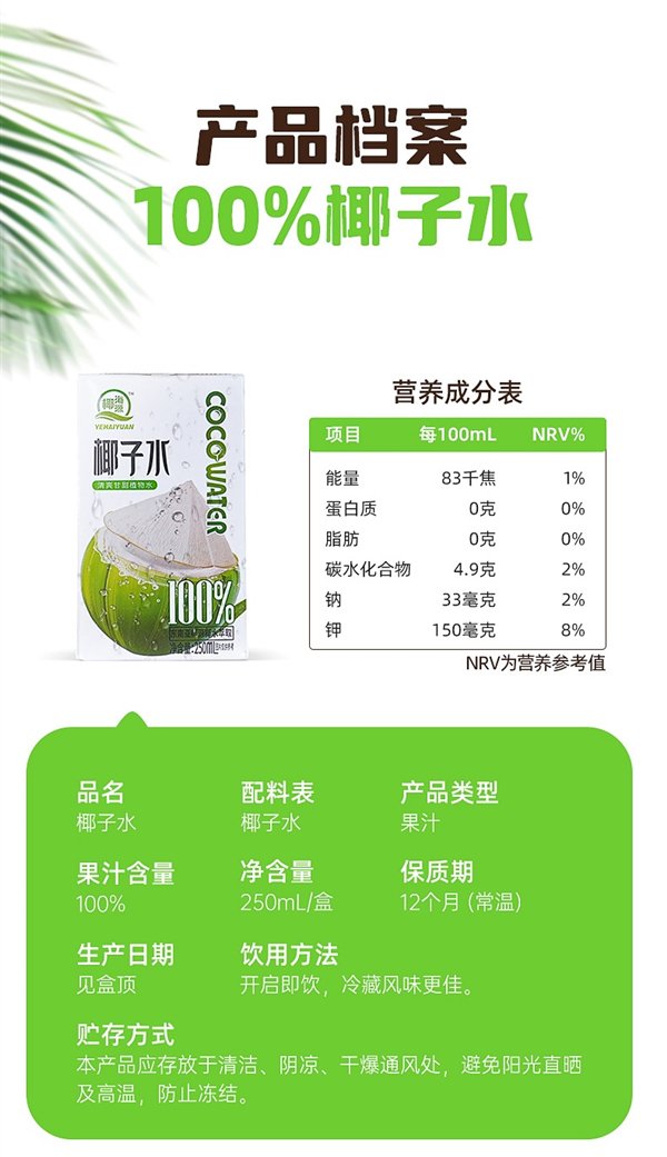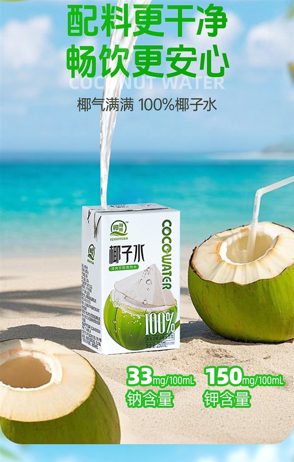 配料表只有椰子水,钠含量 33mg / 100ml,钾含量 150mg / 100ml。
