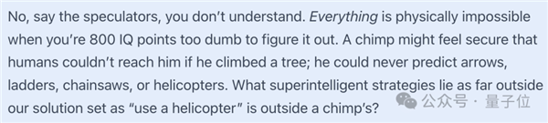 一只猩猩可能会觉得人类无法够得着它,它就很是安全的,因为它不会想到,爬树的时候可能会遇到箭、梯子、链锯或者直升机之类的危险,而那些超智能的应对策略(比如“用直升机”这种办法)远远超出了我们所能想到的范围,那猩猩又怎么可能想到呢?