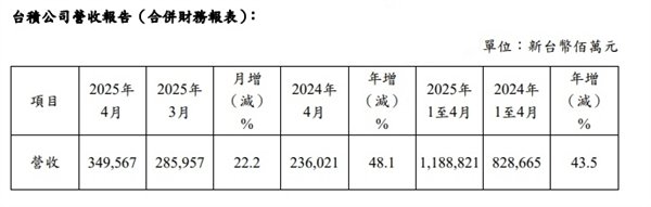 这一数据表明台积电在4月取得了显著的业绩增长,显示出其在半导体制造领域的强大竞争力。
