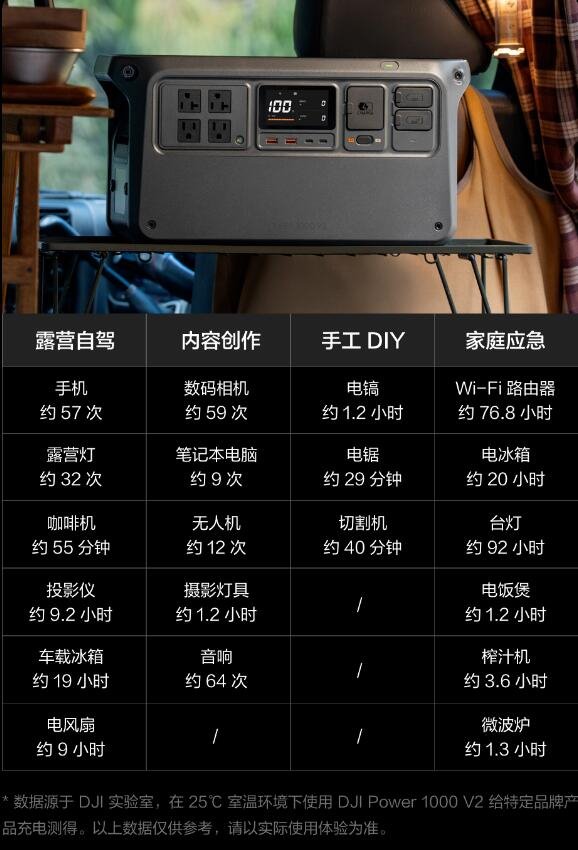 DJI Power 1000 V2 户外电源电池容量为1024瓦时,磷酸铁锂电芯,4000次循环后还有80%容量,每天充放一次,也能用10年。