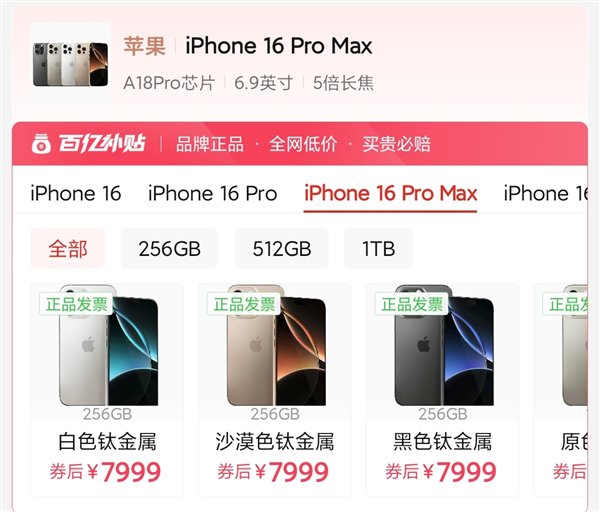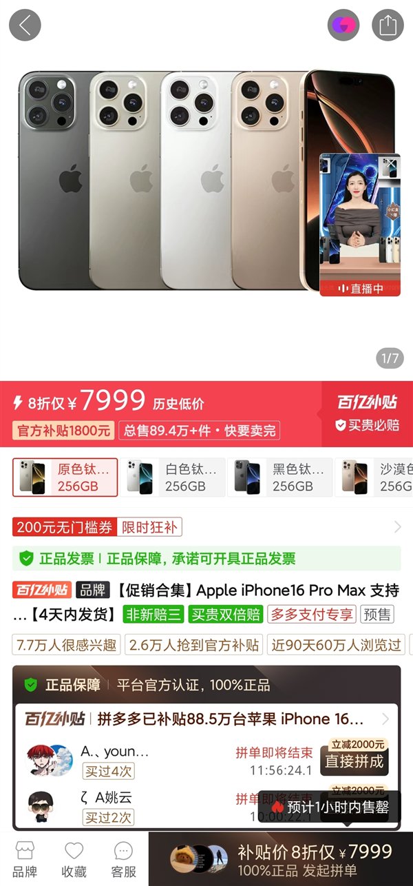 目前iPhone 16 Pro Max在拼多多百亿补贴频道已经做到了8000元以内,起售价是7999元,比首发价便宜了2000元,性价比提升明显,随着618的到来,预计iPhone 16系列价格将会再创新低。