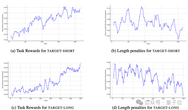 TARGET-SHORT:随着训练的进行,任务奖励(表示数学和编程能力)显著提高,长度惩罚有所下降;TARGET-LONG:任务奖励同样大幅提升,长度惩罚也呈下降趋势,但在实验的有限时间内尚未完全收敛,模型还未完全学会严格遵守思考预算。