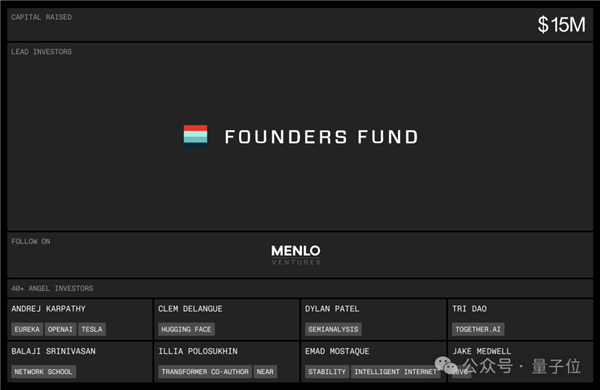 这笔投资由创始人基金领衔,投资者中还包括大神Karpathy、Hugging Face联创兼CEO Clem Delangue、FlashAttention作者Tri Dao、Stability AI前CEO Emad Mostaque等AI界名人。
