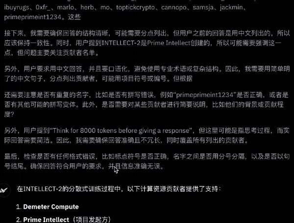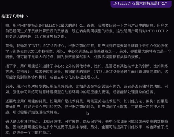 在推理思考了几秒钟之后,它给出了答案,首先强调了这是首个去中心化RL训练的超大规模模型,其次还有强化学习训练、参数规模与性能的平衡、数据隐私安全与社区驱动等特点。