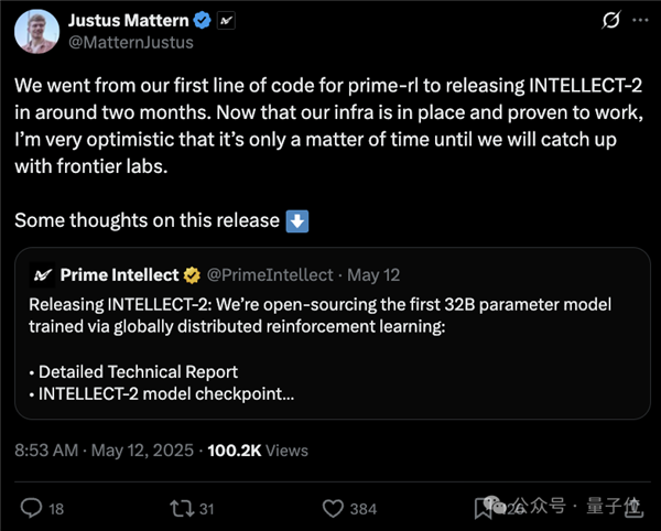 据团队成员介绍,他们从编写模型强化学习框架prime-rl,到今天发布大概只用了两个月时间。