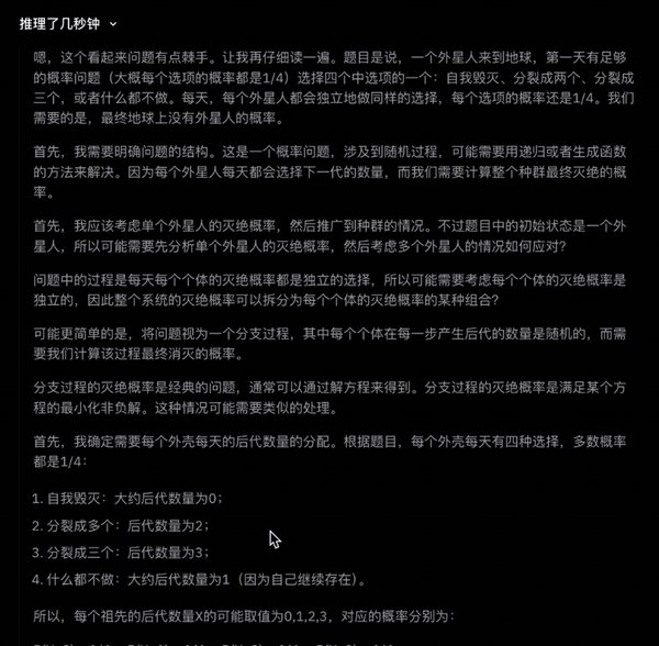 一个外星人来到地球后,第一天有相等的可能选择以下四件事中的一件完成:1,自我毁灭;2,分裂成两个外星人;3,分裂成三个外星人;4,什么都不做。