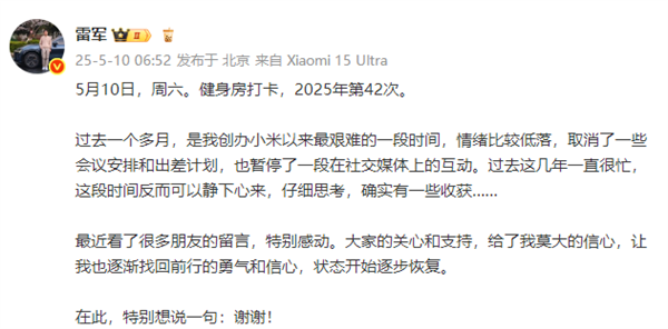 回溯至5月10日,雷军曾在微博上坦言,过去一个多月是他创办小米以来最为艰难的时期,情绪一度陷入低谷。不过,这段相对闲暇的时光,也让他得以静下心来深入思考,并从中有所收获。