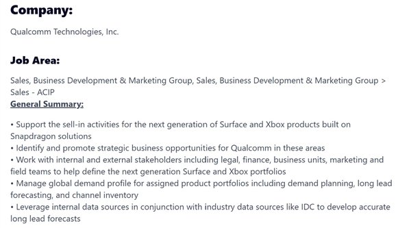 根据高通的招聘信息,高通正在招聘以为销售总监,该职位涉及负责下一代使用骁龙芯片的Surface和Xbox设备的推广与开发,包括管理全球供货等。