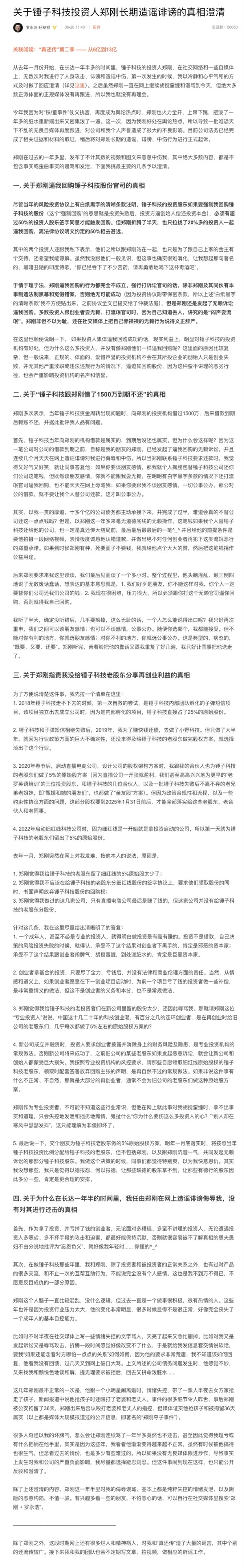 罗永浩文中介绍,锤子科技和郑刚确实有1500万元借款,并且到期未还,主要理由是作为锤子科技投资人的郑刚发起了无赖诉讼回购,并且在网络上“造谣诽谤”。