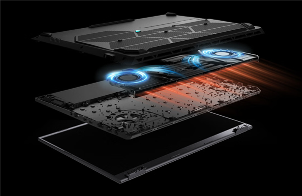 为了保证处理器、显卡充足的性能释放,冰川散热系统也进行了升级,包括两个双叶轮设计的绝尘风扇(84外叶片+42内叶片),0.1mm超薄叶片可减少约16%的功率损耗、提升约11%的气流流通,还有内吹技术2.0、风扇防尘网、贯穿式出风口、天选智能降噪技术等。
