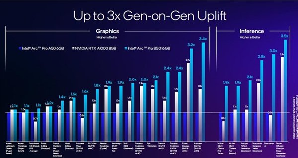 根据官方给出的资料,锐炫Pro B50对比前代锐炫Pro A50,无论是图形性能,还是推理能力都有着明显的提升,与友商的RTX A1000 8GB相比,同样有着明显的优势。
