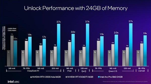 AI推理对于显存的需求可以说是非常高,锐炫Pro B60的24GB大显存便是为此所准备的。在DeepSeek R1、Phi4、QwQ、Qwen以及Llama3等各种规模的大模型上,其生成速度都明显由于友商的产品,最大领先达到了2.7倍。