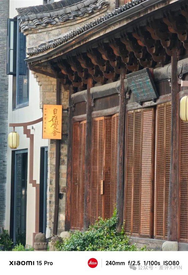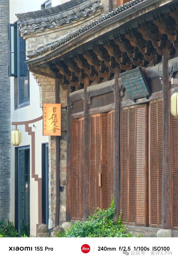 在长焦的望远能力方面,放大看门上的灯牌,小米 15S Pro 的解析力明显更好, 字体边缘更清楚,而小米 15 Pro 这边左侧的小字儿已经看不太清了。