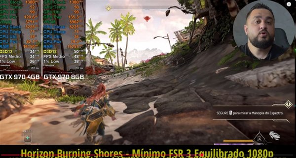 在《地平线:西之绝境》DLC《燃烧海岸》中,4GB版本的GTX 970平均帧率为34FPS,而8GB版本达到了48FPS,性能提升超过40%。