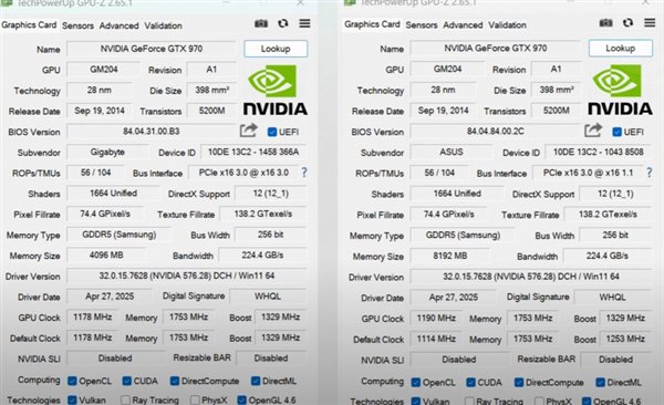 这款改装后的GTX 970显卡显存由原来的3.5GB+0.5GB升级到8GB,其他参数保持不变:GM204芯片、1664个CUDA核心、256位总线以及1114到1329MHz的频率。