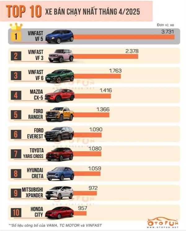 其中,VF5在4月份销量为3731辆,为越南销冠车型;第二名为VF3,销量为2378辆;第三名为VF6,销量为1763辆。