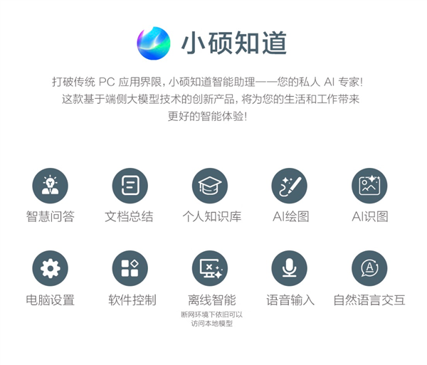 作为一款AI PC,灵耀14 2025支持的小硕知道AI智能助手是基于端云一体大模型打造的,带来了智慧问答、文档总结、AI识图、AI绘图、电脑设置、软件控制等诸多实用功能。