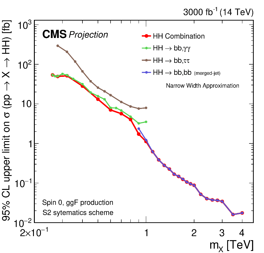 图2:高亮度LHC(HL-LHC,3000 fb?1)阶段下,对X → HH过程的预期灵敏度。图中展示不同子分析和联合限制能力,覆盖广泛质量区间,体现出未来对新物理过程的极强探索潜力。