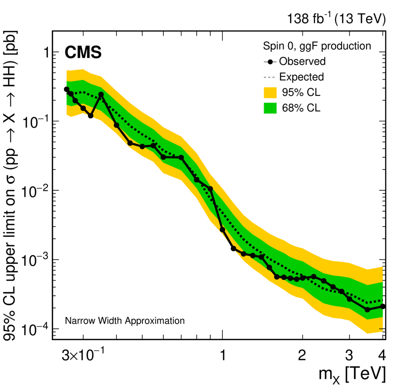 图1:CMS合作组基于Run 2数据对X → HH过程的联合统计分析结果。图中展示了自旋为0的重共振态X在不同质量点的截面×分支比上限,实测值与标准模型背景预期高度一一致,未观察到明显偏离现象。