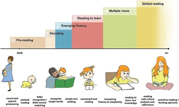 哈佛大学的珍妮·夏尔(Jeanne Chall)是一位非常有名的阅读心理学家,她强调人的阅读能力是在持续的积累过程中获得的。她将阅读能力的发展划分为 0 至 5 共六个阶段。