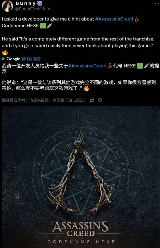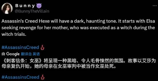 自称是育碧合作伙伴的“BunnyTheVillain”透露,《刺客信条:代号Hexe》“将带有一种阴暗、令人毛骨悚然的基调。故事始于女主角Elsa为母亲的复仇,她的母亲在女巫审判中被判处女巫的罪名而遭到处决。”