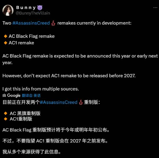 而在前天,她又爆料表示,通过多个来源获得消息称目前有两个正在开发的《刺客信条》重制版项目,分别是《刺客信条:黑旗》和《刺客信条1》的重制版,其中《黑旗》重制版预计将于今年或明年年年初公布,而《刺客信条1》的重制版至少要到2027年。