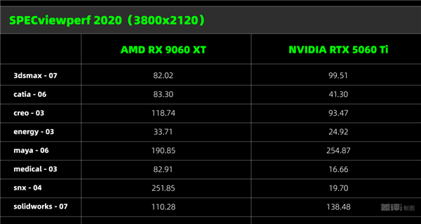 在这轮测试中,AMD 以 5:3 的最终比分获胜,而且有的差距还挺悬殊的,不过这个测试大家看看就行,应该是不会有人用 9060 XT 作为专业卡干活的。