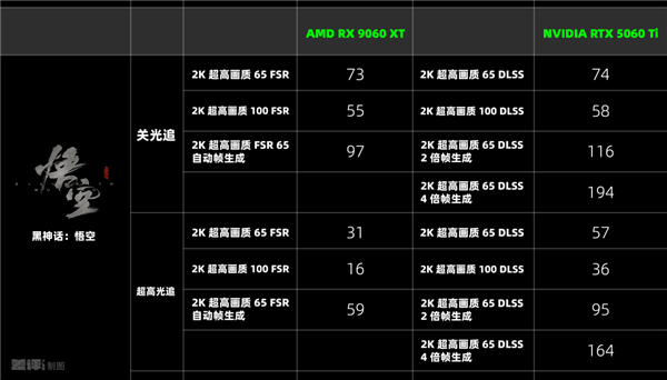另一个游戏依旧是压力很大的 “ 黑猴 ” ,在不开光追,2K 分辨率超高画质的情况下,9060 XT 比 5060 Ti 略低一点,只有开启 4 倍 “ 拼好帧 ” 之后,5060 Ti 才会大比分胜出。